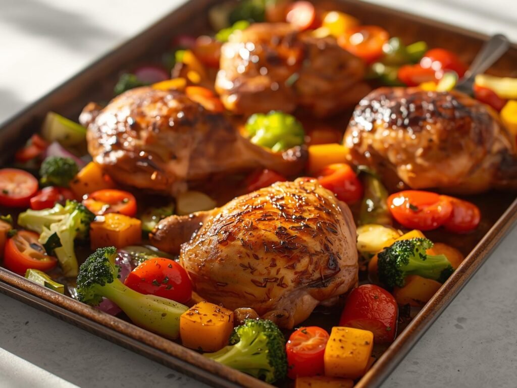 - Chicken thighs, carrots, potatoes, broccoli, olive oil, and herbs.
