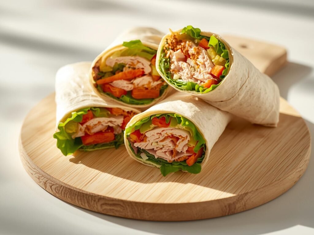 - Whole wheat tortilla, turkey slices, shredded carrots, lettuce, and hummus.
